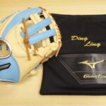 ミズノ グローバルエリート 軟式 内野手用 父の日モデル ブロンド×スカイブルーと付属のグラブ袋に刺繍加工を…