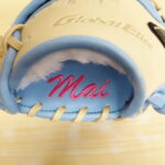 ミズノ グローバルエリート ソフトボール 内野手向け スカイブルー×ブロンドと付属のグラブ袋に刺繍加工をした…