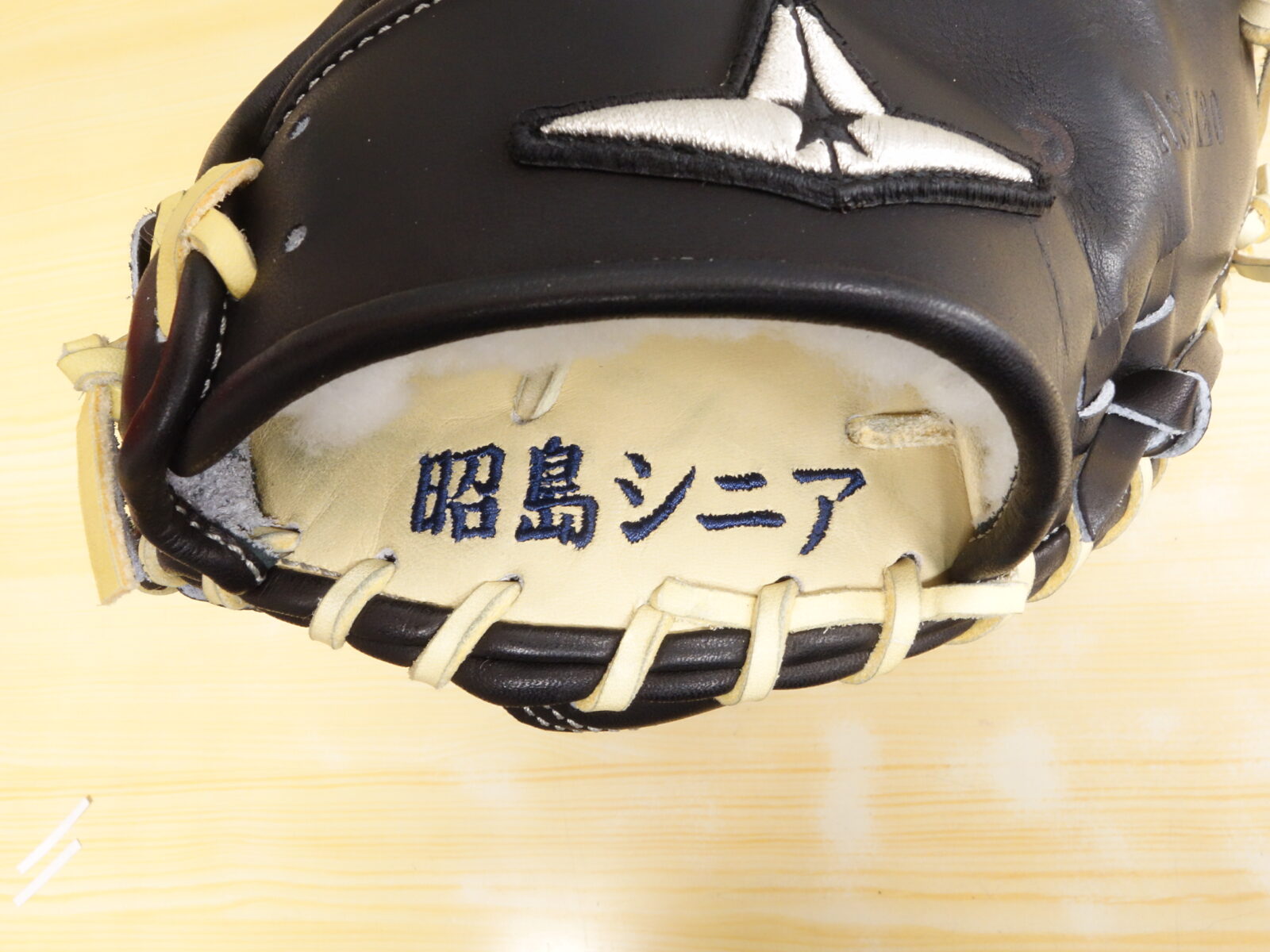 昭島シニア 様 オールスター 硬式 小型 キャッチャーミット 手の平ドテ部分 刺繍加工・型付け加工 042-347-1122 〒187-0043 東京都小平市学園東町3-3-16 営業時間10:00~20:00(日祝 9:00~19:00)水曜定休